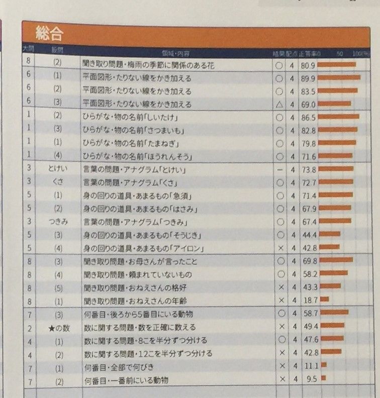 年長は、算数、国語の区別がないので総合の1科目のみの結果となります。