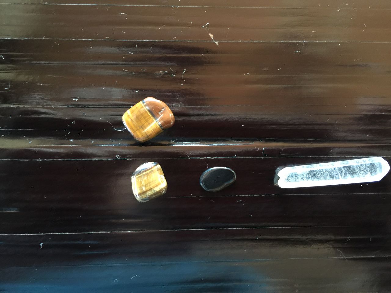 写真左が「タイガースアイ」、真ん中が「ブラックオニキス」右が「六角水晶」です。