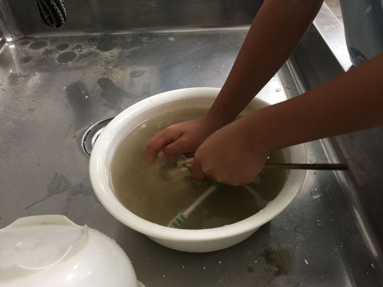 取り出した化石を水であらい、ブラシでこすって泥を落とします。
