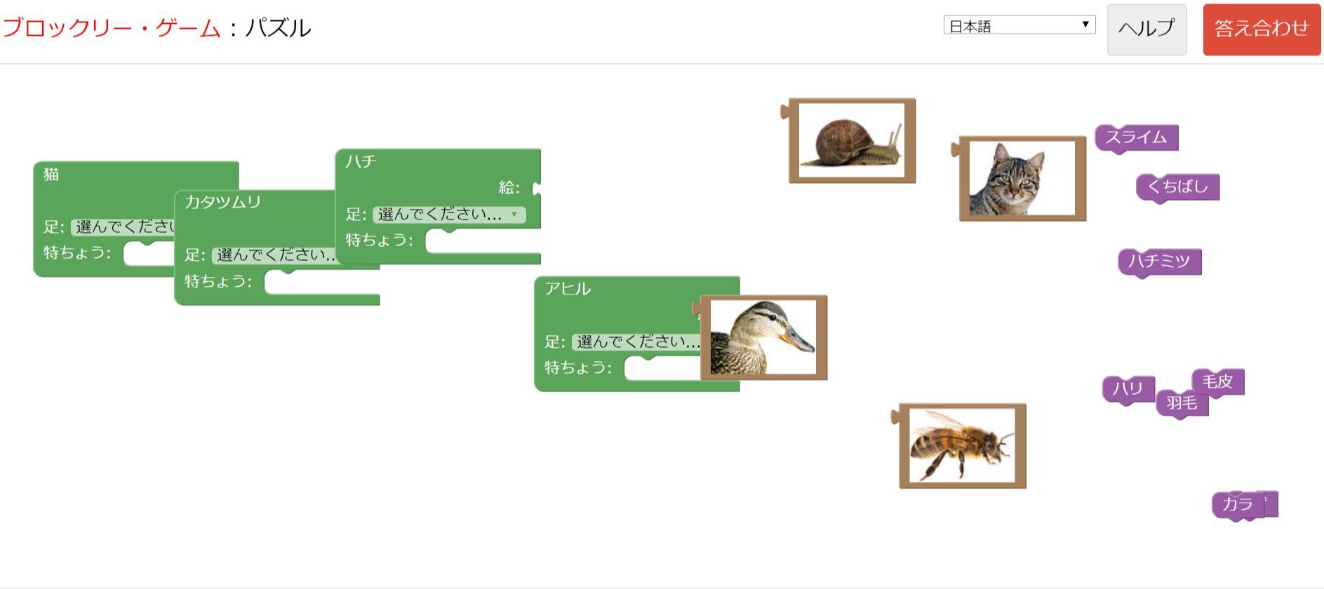 紫のブロックを選んで、緑のブロックの