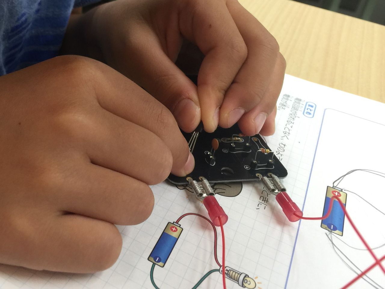 さて、テストと保護者向けの説明会が終わるとお楽しみの実験タイムです。まずは、座学で豆電球を題材にして、どう乾電池に配線したら明かりがつくのか?を確認します。