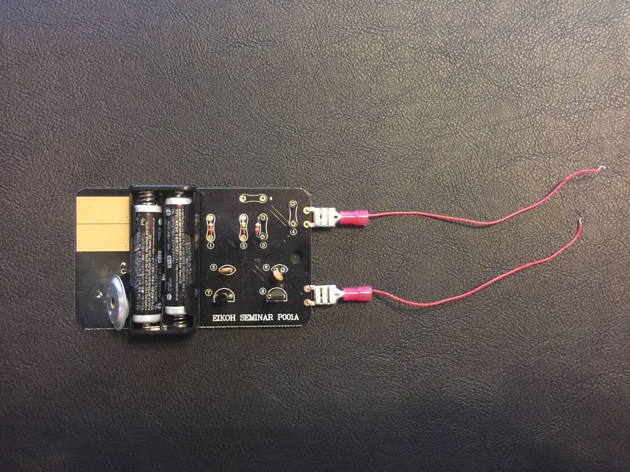 さて、この実験用の回路ですが、端にコードが出ており、電気が通るとスピーカーから音が出るように出来ています。