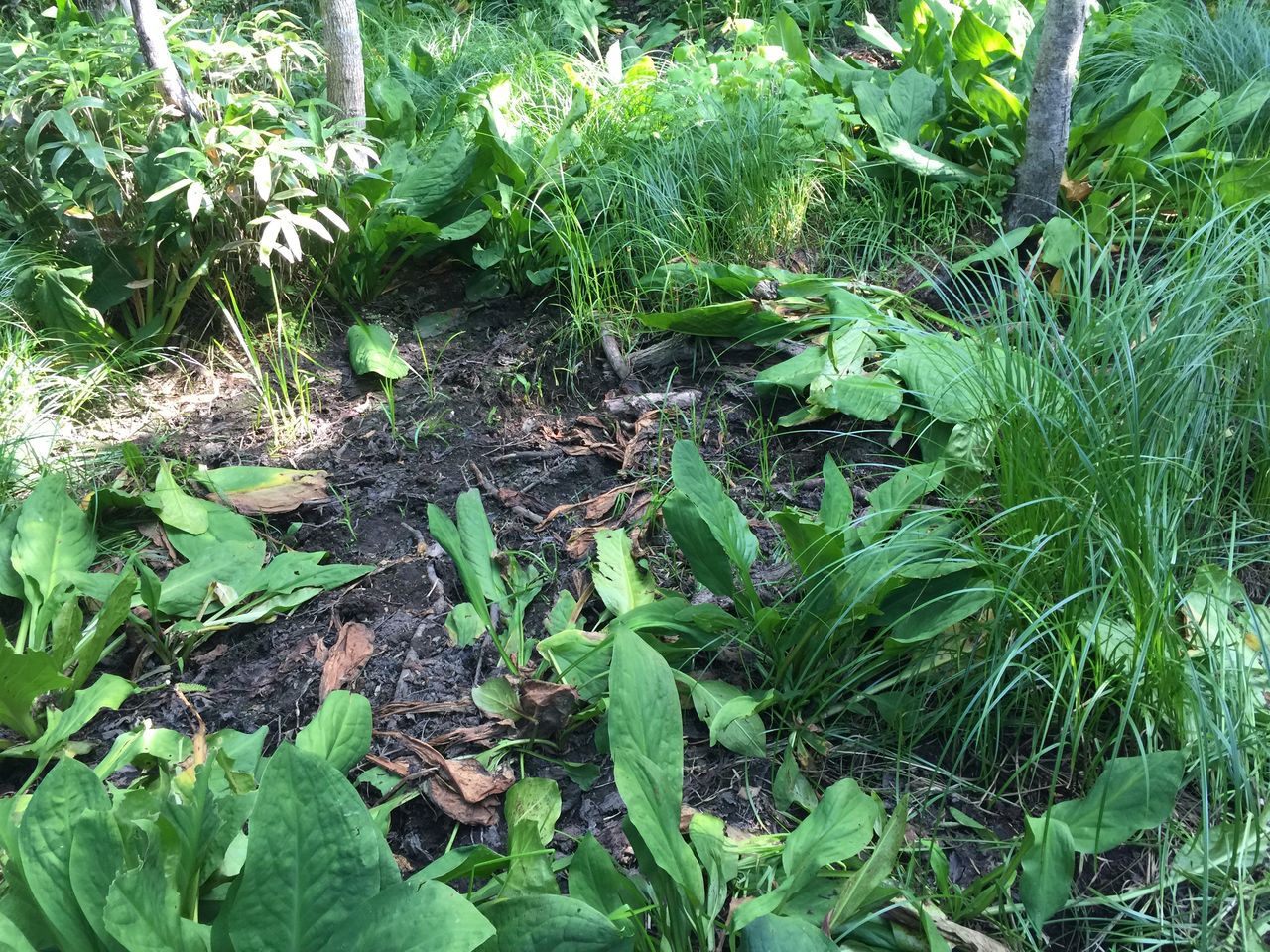 残念ながら(?)ヒグマを見ることはできませんでしたが、ヒグマの痕跡を見ることが出来ました。こちらは、水芭蕉という植物。ヒグマはこの水芭蕉の根が好物のようで、掘り返して根っこを食べます。ガイドさんによれば、新しい痕跡なので、つい数時間前に掘り返して食べた跡とのことです。